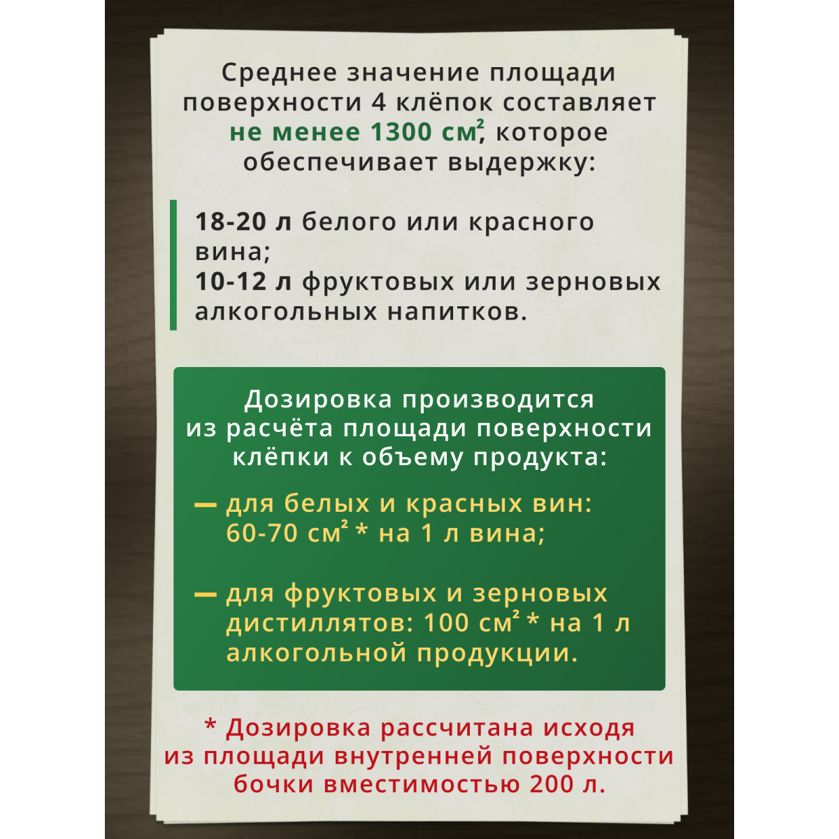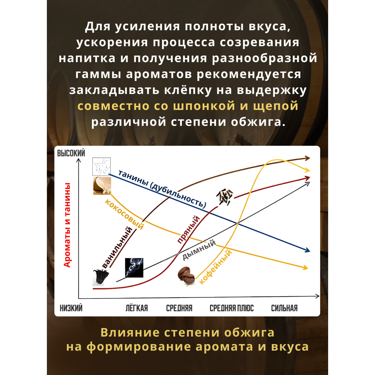 Для усиления полноты вкуса, ускорения процесса созревания напитка и получения разнообразной гаммы ароматов, рекомендуется закладывать клепку на выдержку совместно со шпонкой и щепой различной степени обжига.
