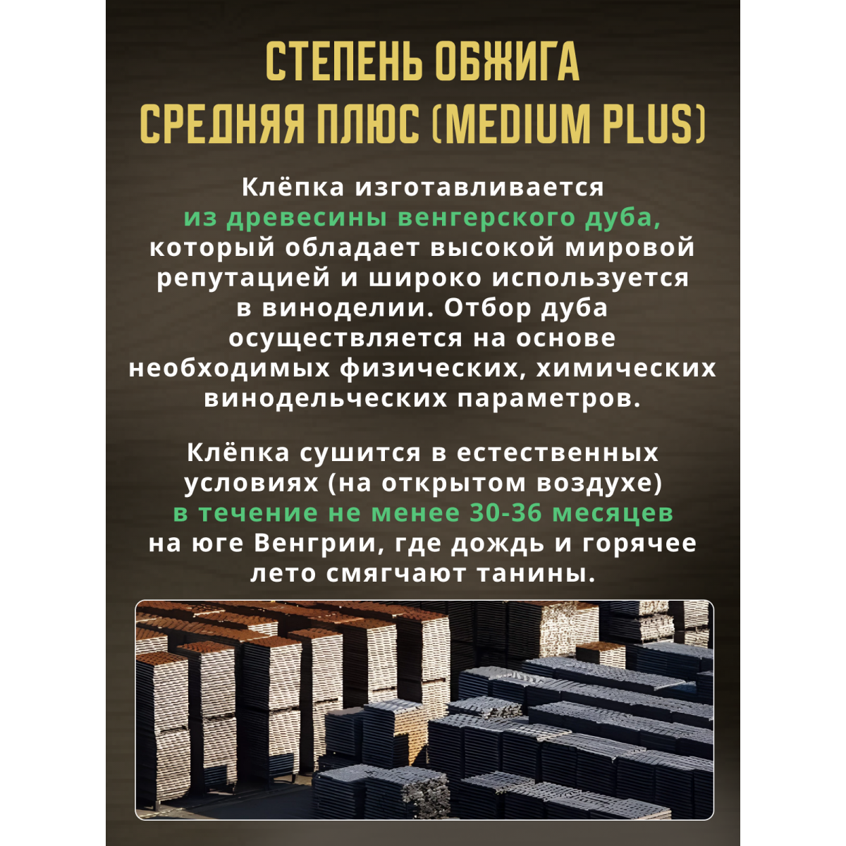 Клепка изготовлена известным венгерским производителем дубовых бочек, а также других товаров для выдержки из дуба Trust Hungary Zrt. (входит в состав компаний известного французского производителя дубовых бочек Francois Freres).