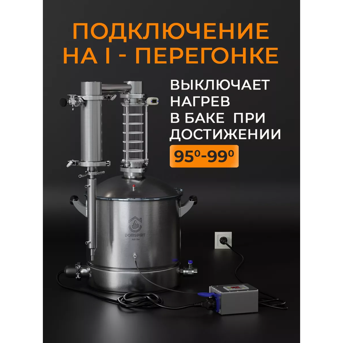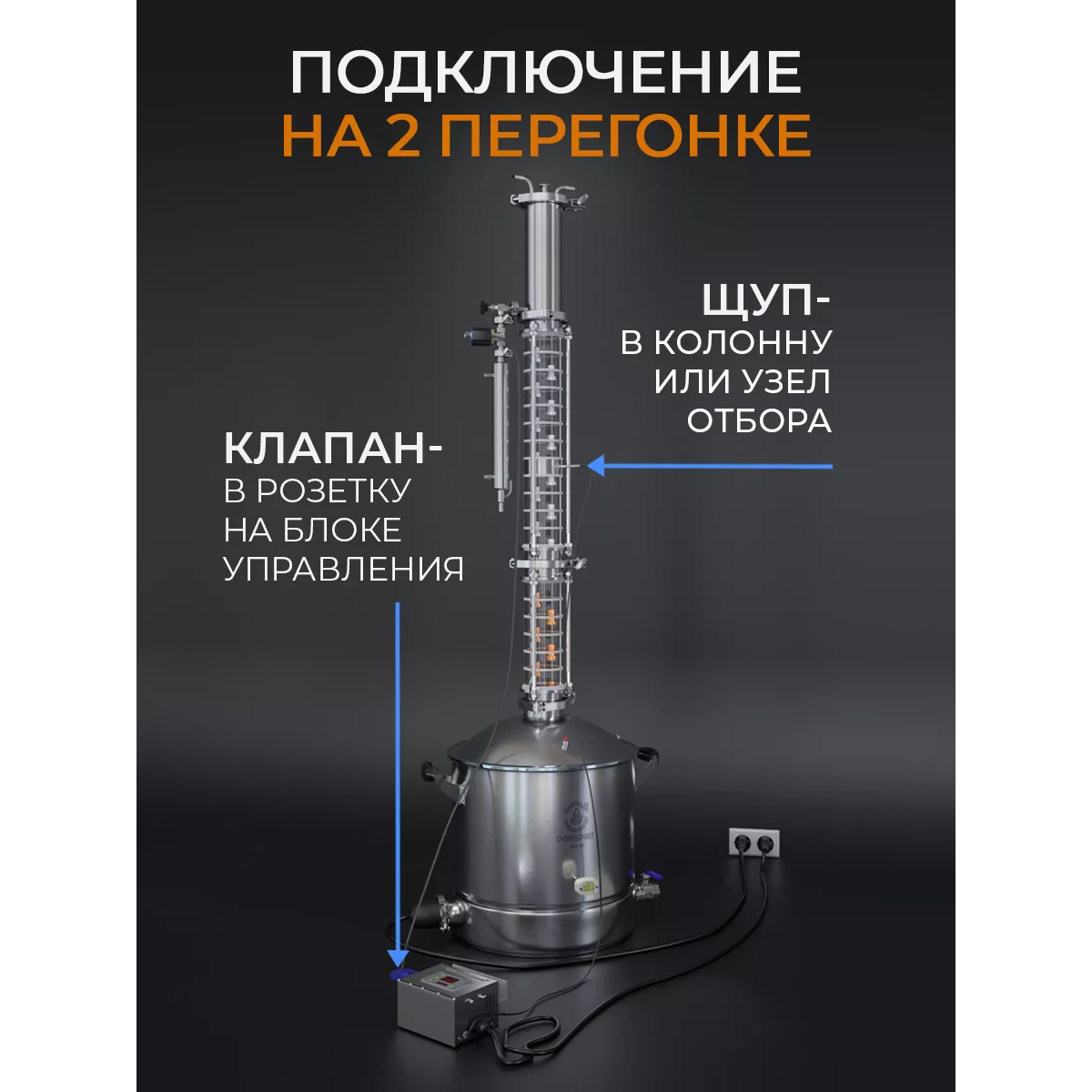 Если установить щуп автоматики в трубку связи с атмосферой на верху колонны и задать температуру отключения 45-65°С, то термостат автоматически отключит аппарат в случае отключения охлаждающей воды. Комплект представляет собой блок управления питанием от стандартной розетки 220В, датчик температуры, клапан для узла отбора, 2 переходника с 1/4’’ резьбы клапана на кламп 1/2’’, 1 кламповый хомут 1/2". Длина кабеля 80 см. Диаметр щупа автоматики 4-5 мм, длина 20-21 мм.