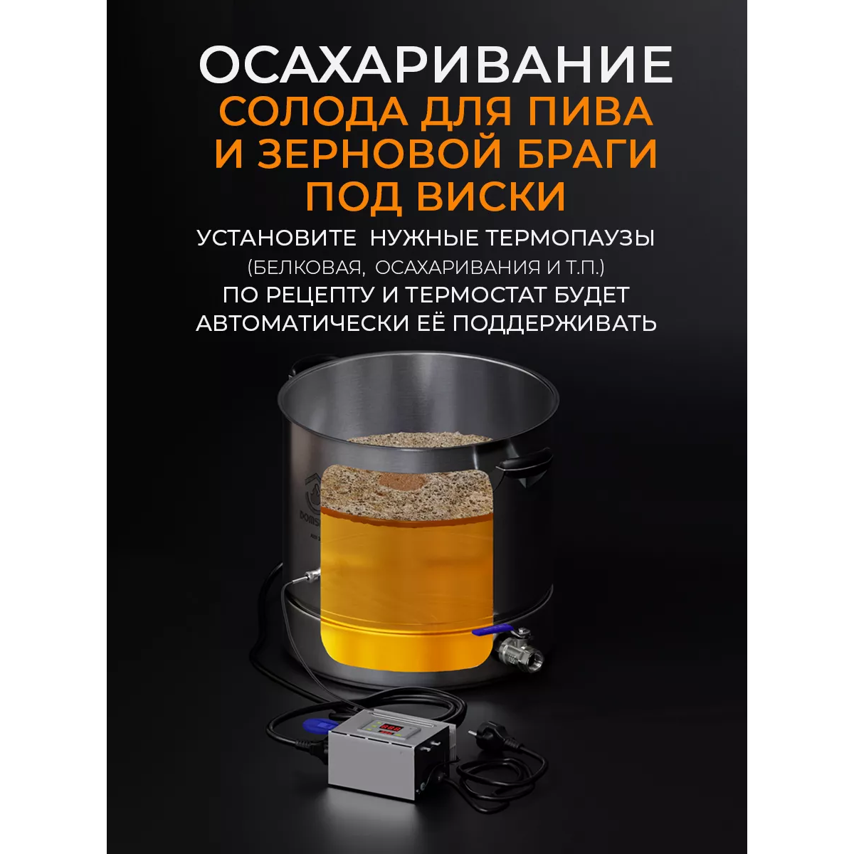 Также автоматика может быть использована для осахаривания солода для пива и зерновой браги под виски. Установите нужную температуру термопауз (белковая, осахаривания и т.п.) по рецепту и термостат будет автоматически её поддерживать, включая или выключая ТЭН. Помимо этого, автоматический термостат может быть использован как аварийный отключатель ТЭНа в случае выключения воды.