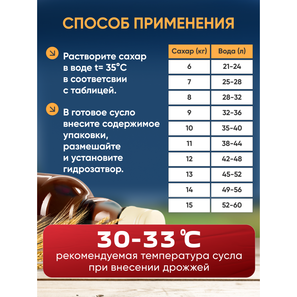 Рекомендации к применению: Растворите сахар в воде температурой 35°С в соответсвии с таблицей. В готовое сусло внесите содержимое упаковки, размешайте и установите гидрозатвор. Рекомендуемая температура сусла при внесении дрожжей: 30-33°С. Температура брожения: 22-29°С. Оптимальная температура брожения: 25-29°C. Хранить при температуре от 0 до 24°С в сухом месте Срок хранения: 24 месяца.