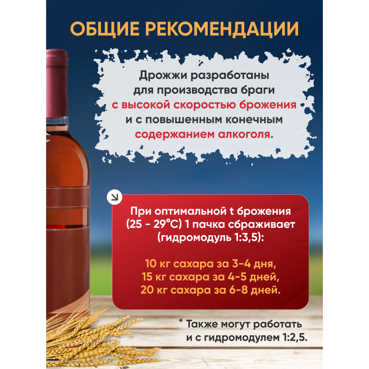 При оптимальной температуре брожения (25 - 29°С) 1 пачка сбраживает 10 кг сахара за 3-4 дня, 15 кг сахара за 4-5 дней, 20 кг сахара за 6-8 дней. Гидромодуль 1:3.5