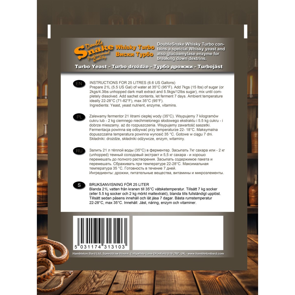 Дрожжи Double Snake Whisky Turbo - специальный дрожжевой продукт от всемирно-известной марки Алкотек для быстрого создания браги из крах-малосодержащих продуктов, в частности, из ячменного солода или кукурузы. Дрожжи turbo-yeast whisky содержат в своем составе, помимо специальных питательных веществ и минералов, глюкоамилазу, которая является эффективным ферментом для химического расщепления сложных сахаров из зерен на простые сахара.