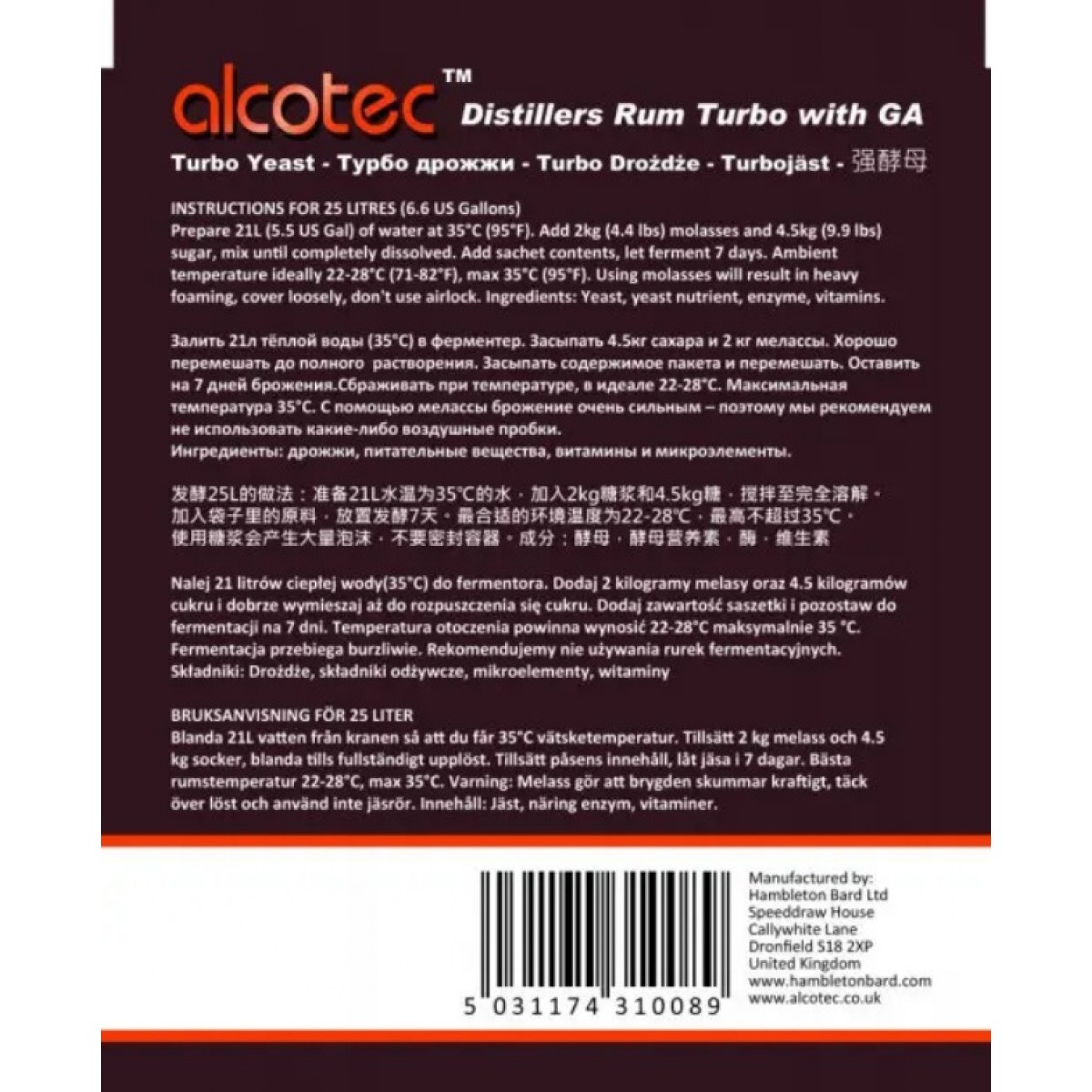 Характеристики Дрожжи спиртовые Alcotec Rum Turbo 73 г