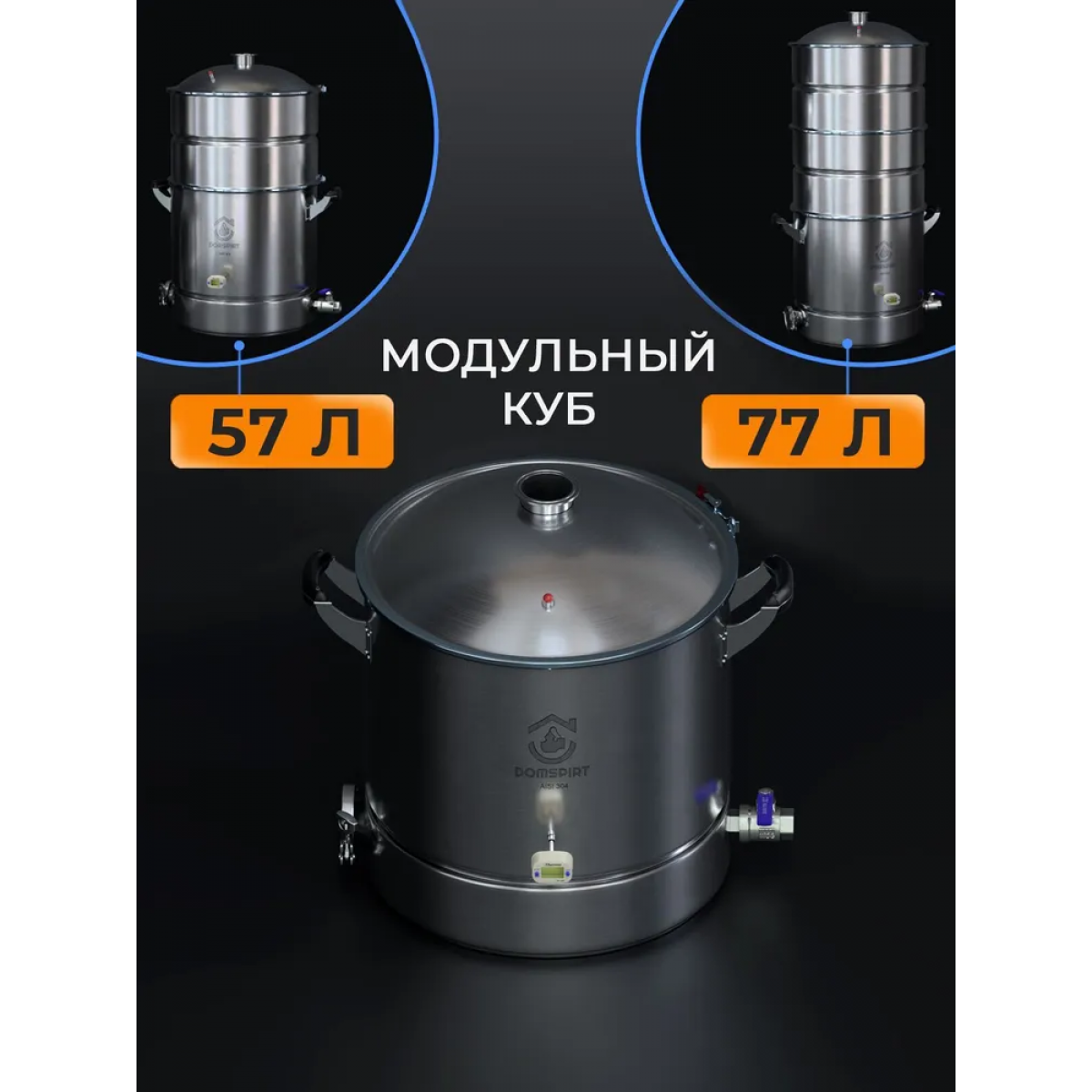 Куб модульный. Базовый объём — 37 л. Каждый доп. модуль имеет объем 20 л. Модульный куб удобен тем, что брага (большой объём) перегоняется в большом кубе с модулями, а сырец (небольшой полученный объём) – в компактном базовом (модули убираются). Меньше теплопотерь, быстрее разогрев, меньше неснижаемый остаток (тэн не оголится).Модули можно заказать вместе с кубом или позже.